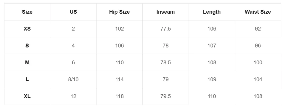 size Waist(cm) Hips (cm) Pant Length(cm)