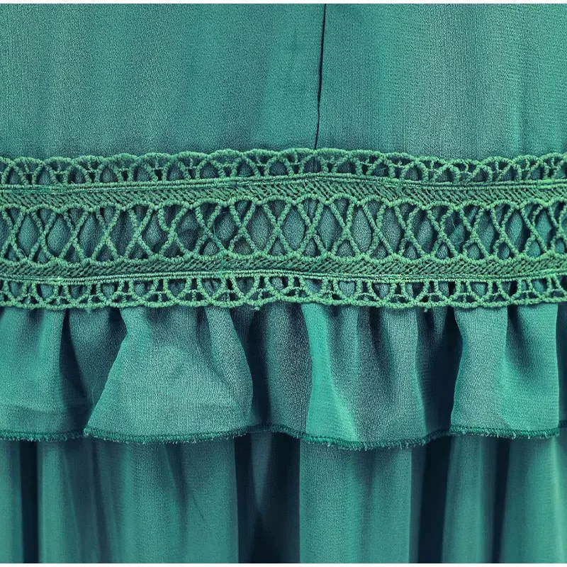 Elegant Hollow Lace Patchwork Ruffle Long Dress For Women Sexy Deep V-neck Lantern Sleeves Slim Maxi Dresses Lady Party Robes