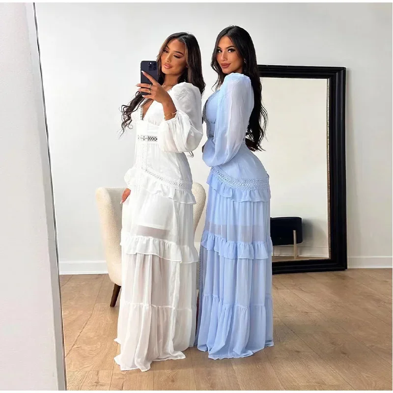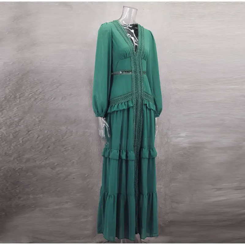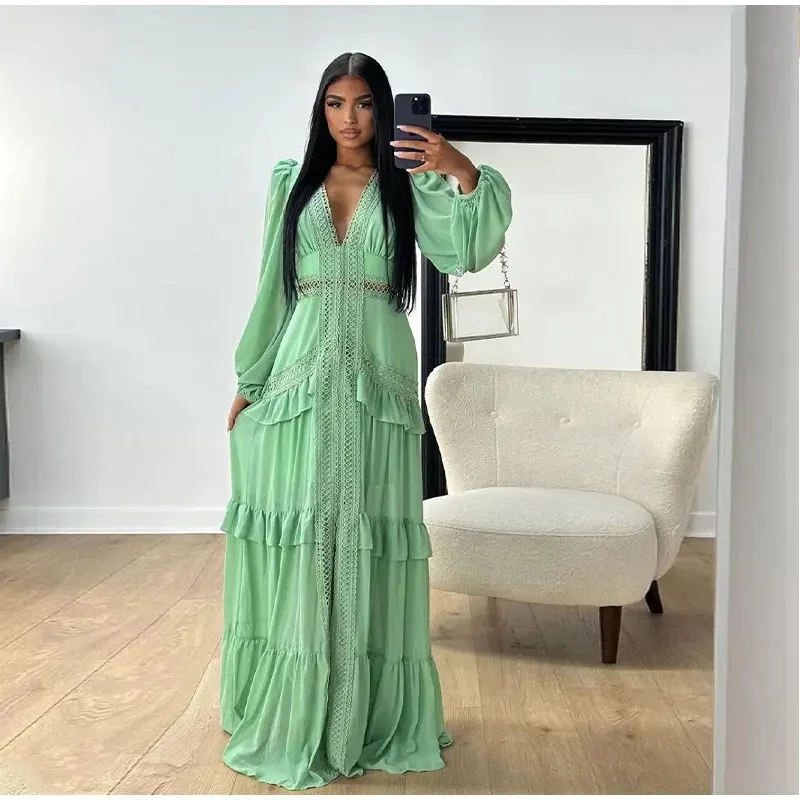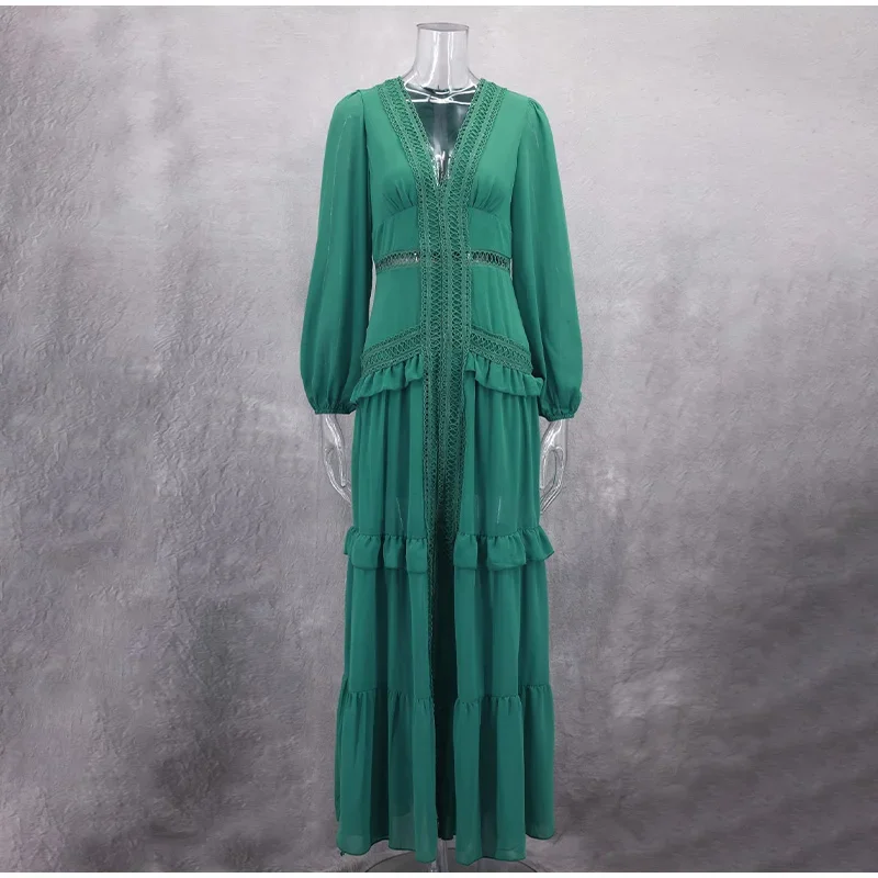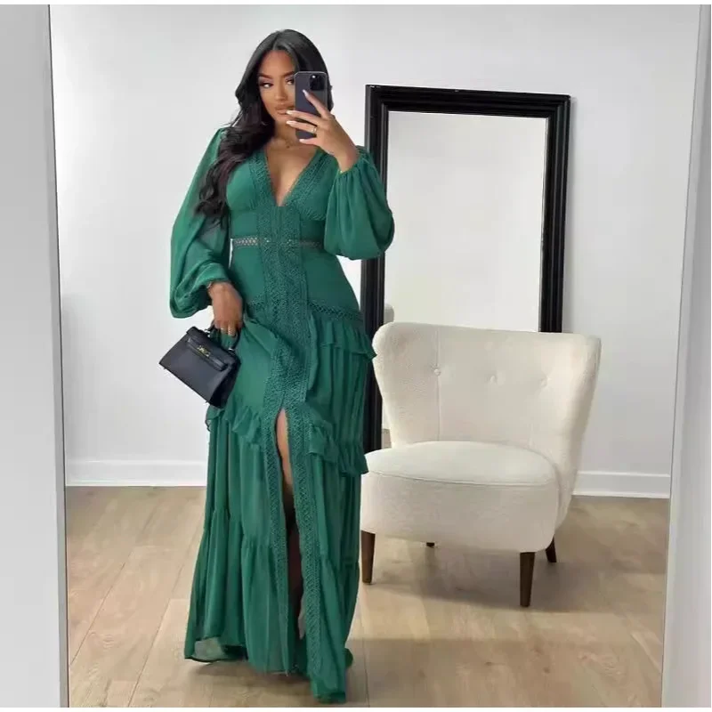 Home » Shop » Elegant Hollow Lace Patchwork Ruffle Long Dress For Women Sexy Deep V-neck Lantern Sleeves Slim Maxi Dresses Lady Party Robes
