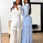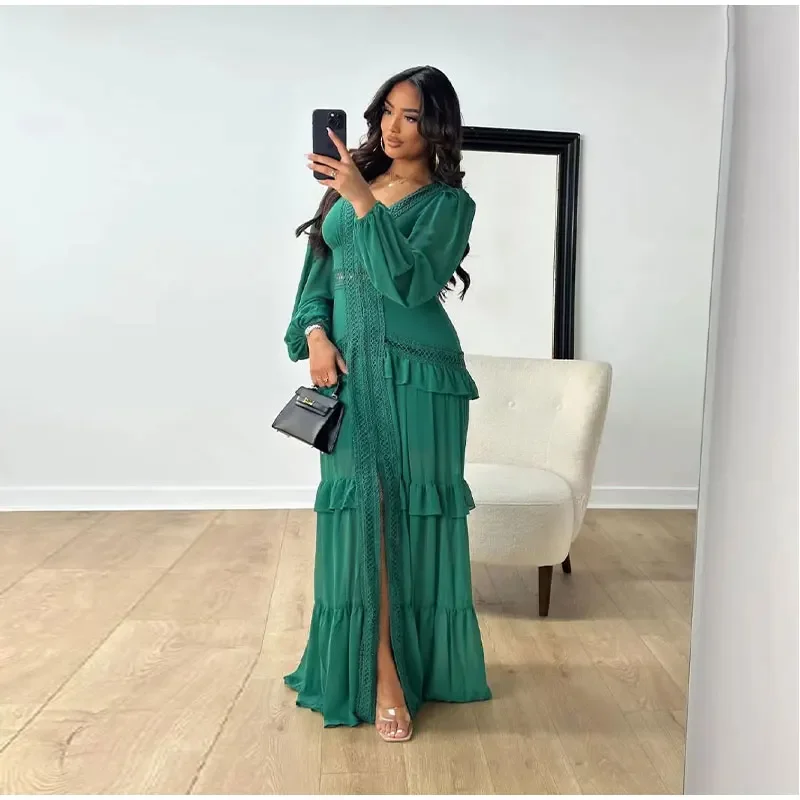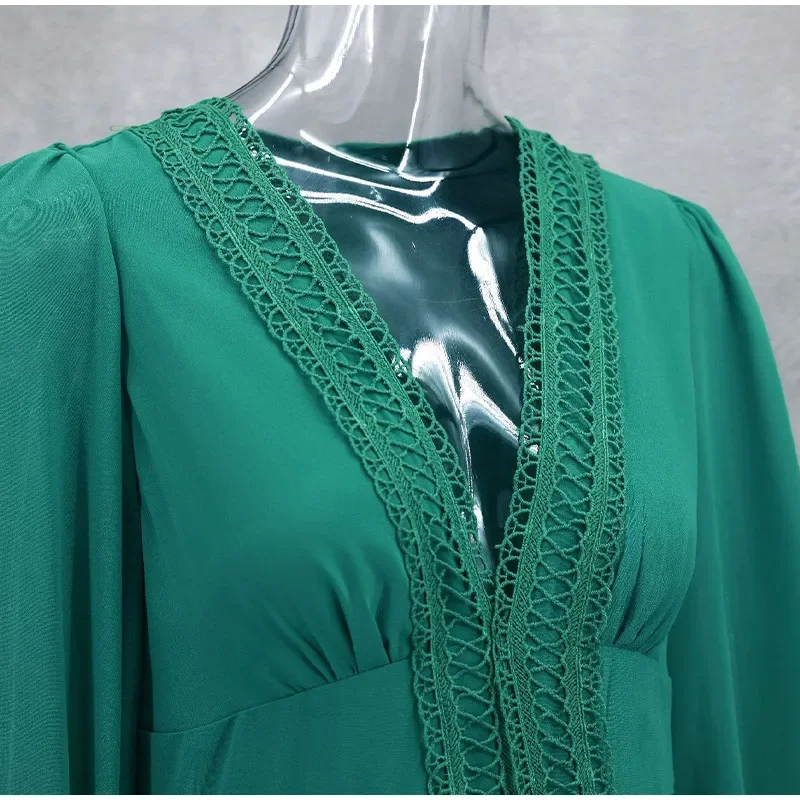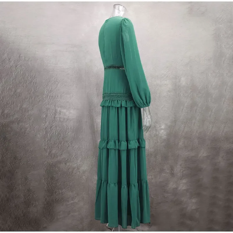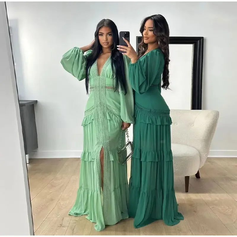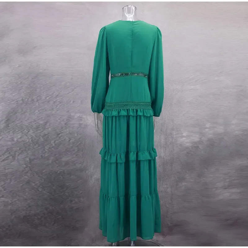 Home » Shop » Elegant Hollow Lace Patchwork Ruffle Long Dress For Women Sexy Deep V-neck Lantern Sleeves Slim Maxi Dresses Lady Party Robes