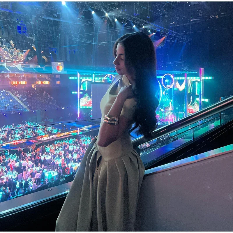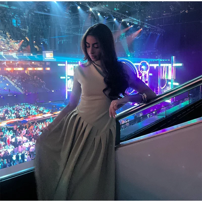 Home » Shop » Elegant Solid Pleated Hem Women A-line Dress Fashion Asymmetry Half High Collar Short Sleeve Maxi Dress Lady Chic Party Robes
