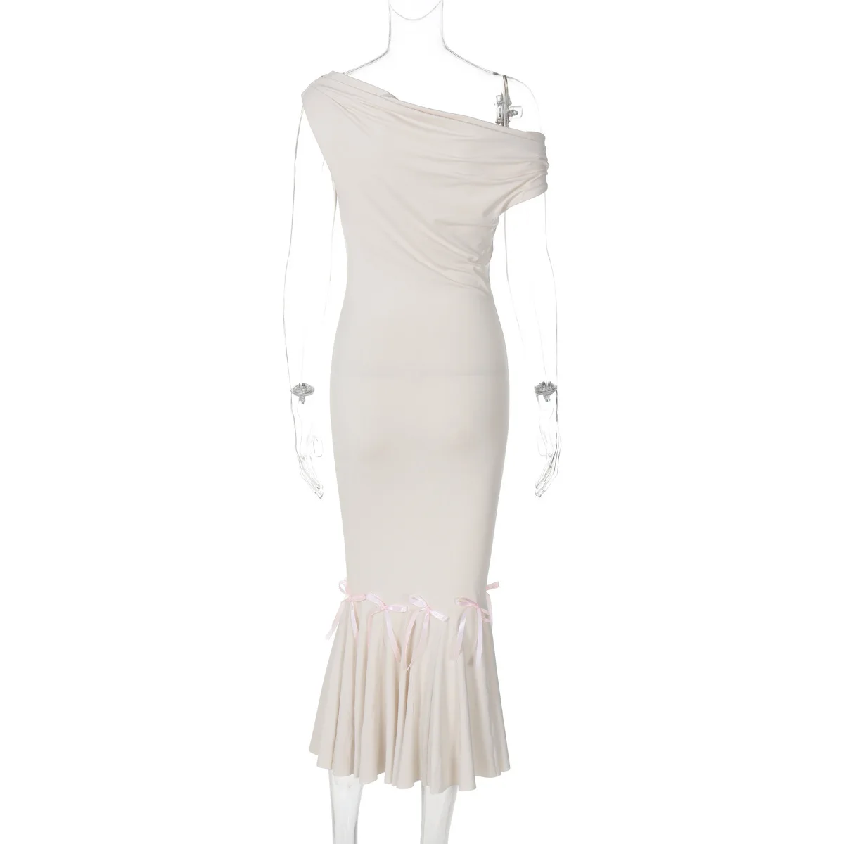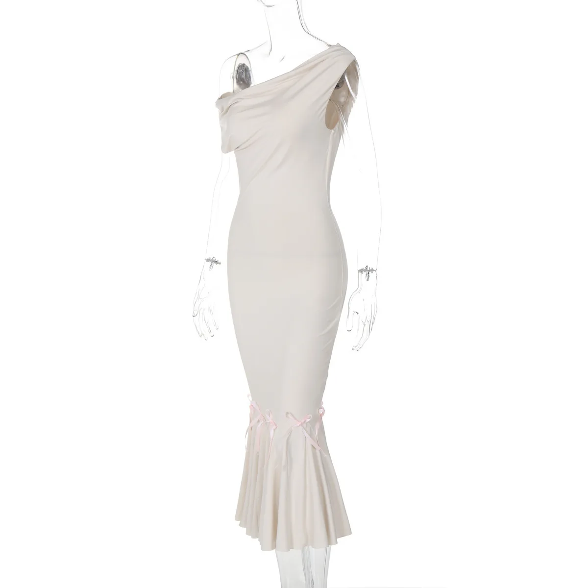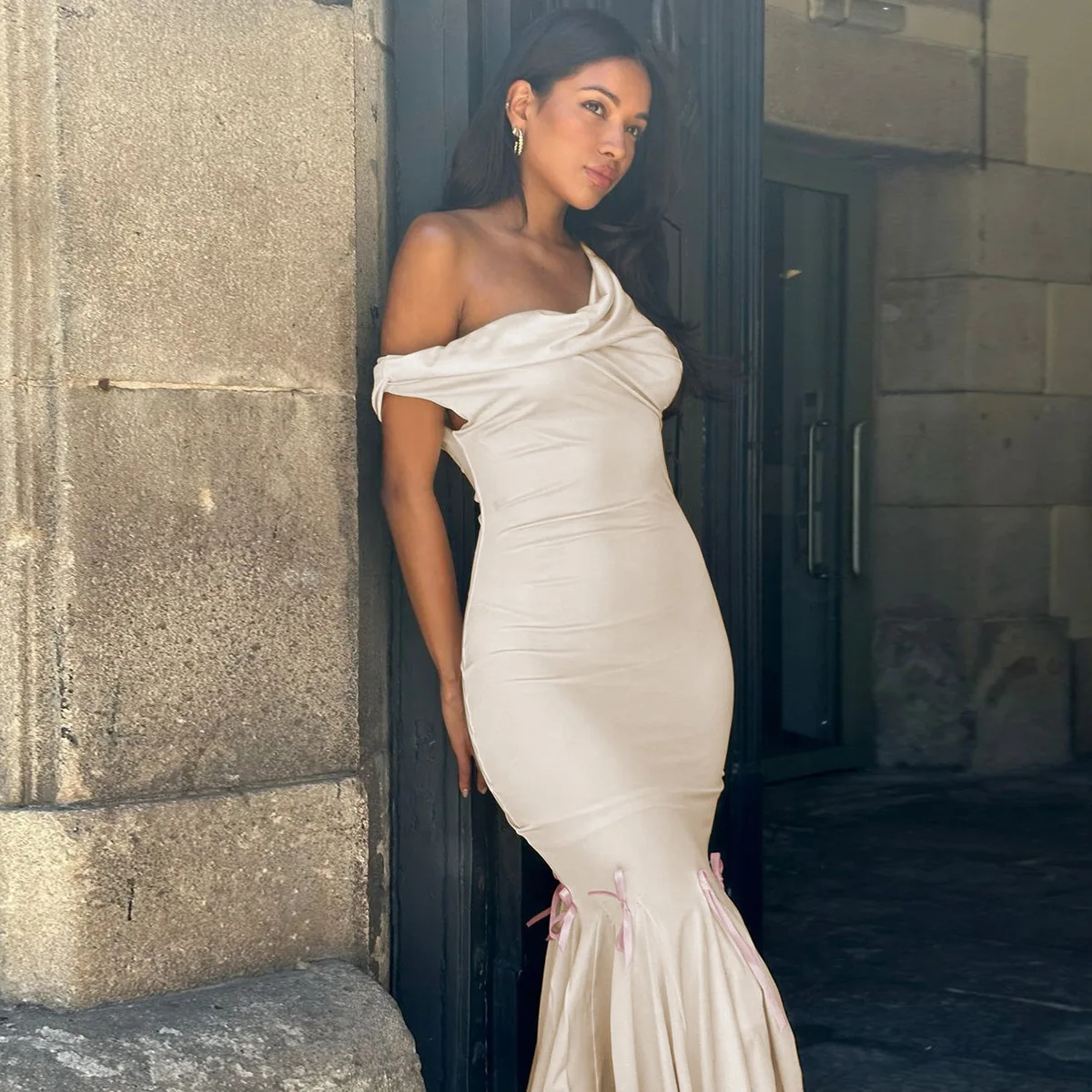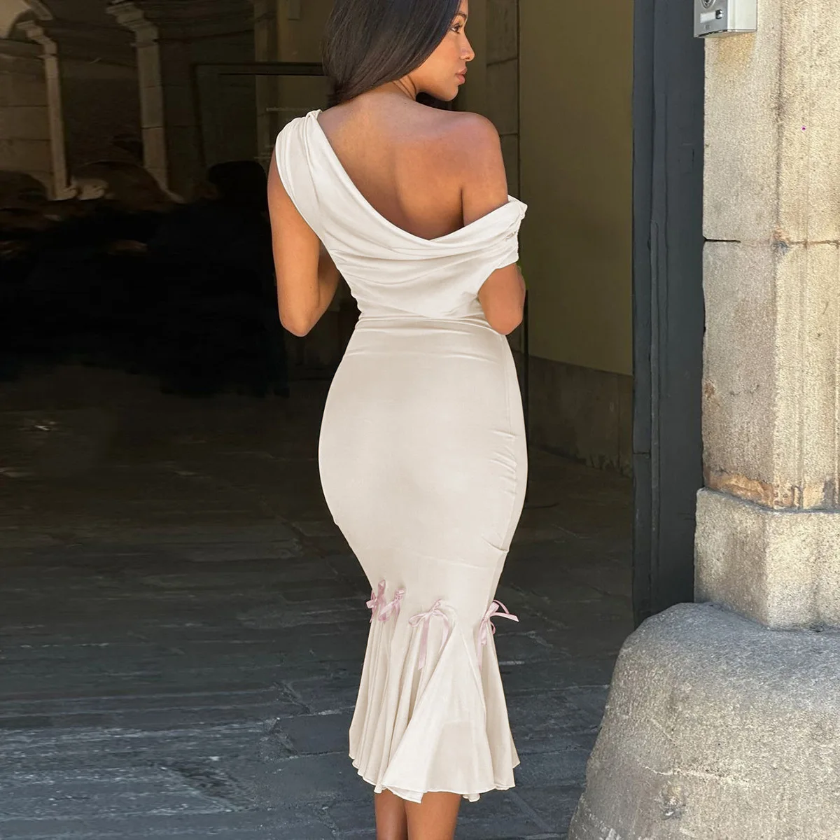 Mozision Oblique Shoulder Backless Sexy Midi Dress For Women Solid Color Sleeveless Bodycon Lace Up Long Fishtail Dress Elegant