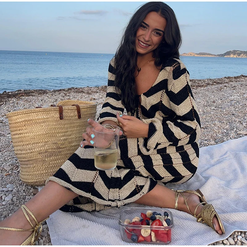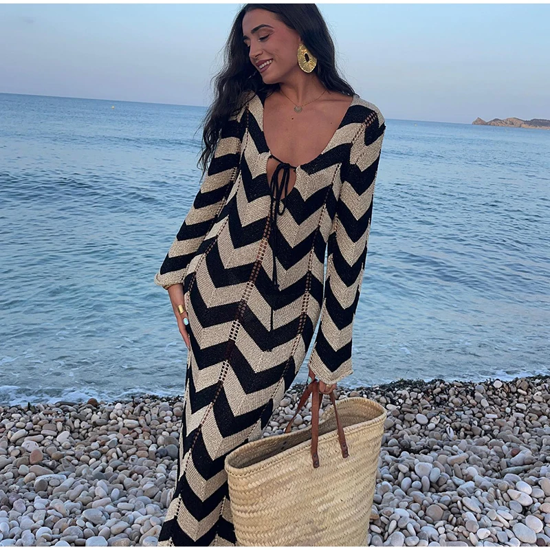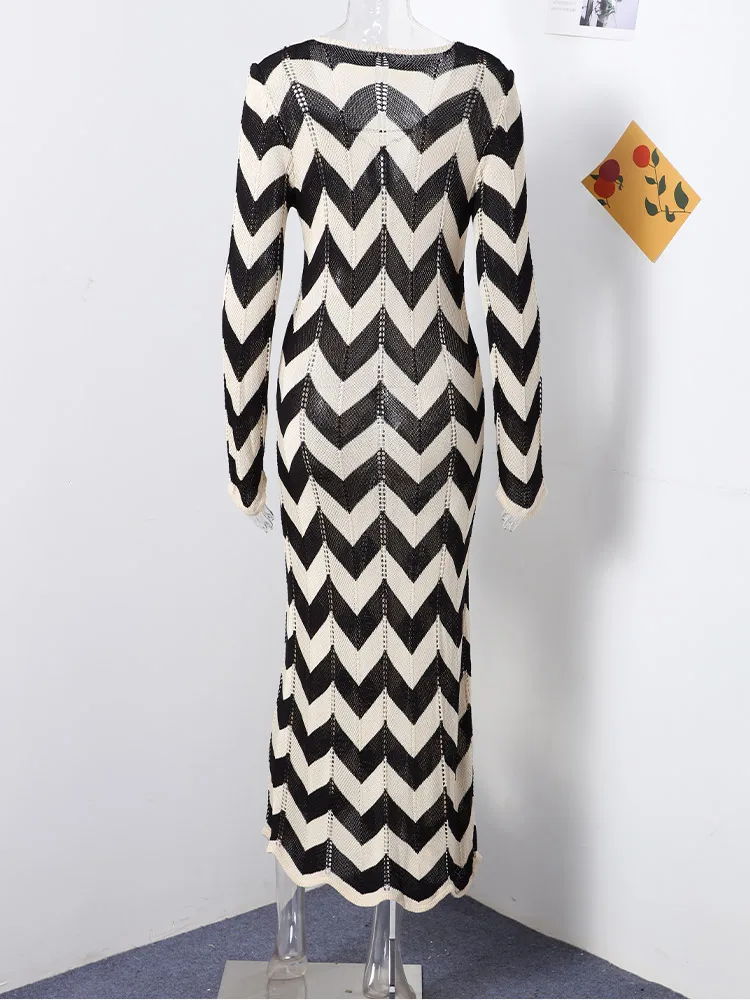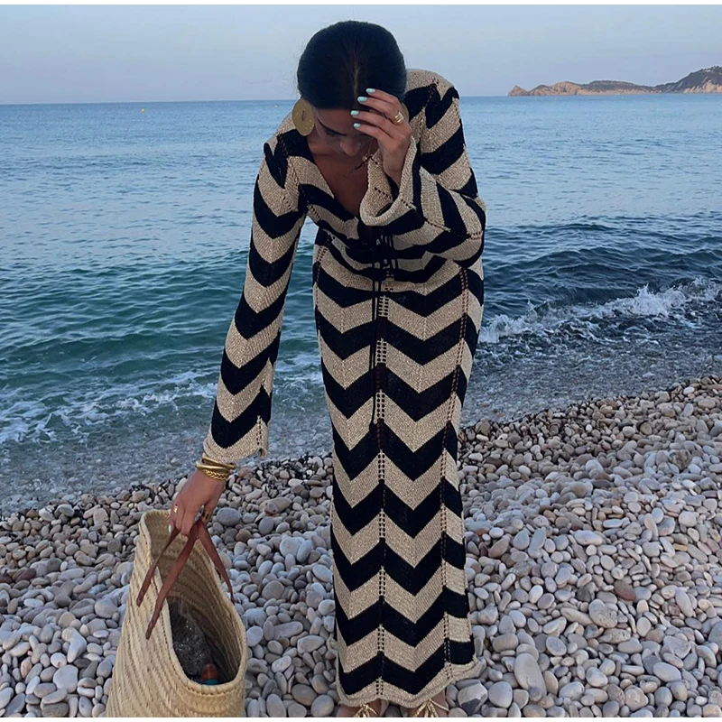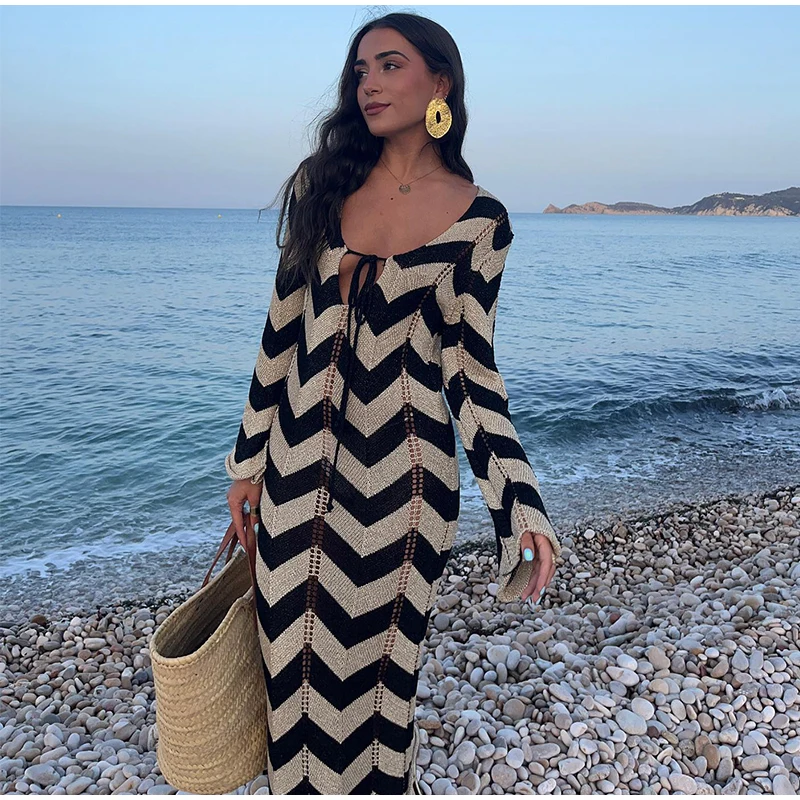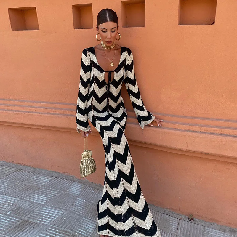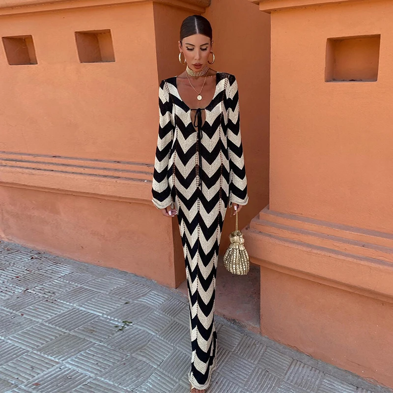 Home » Shop » Striped Knitted Women Dresses Long Sleeve Lace Up Maxi Beach Dress For Woman Slim Knitting Hollow Out Square Neck Robes