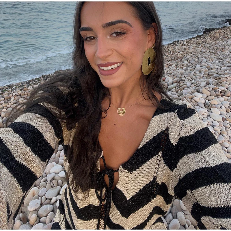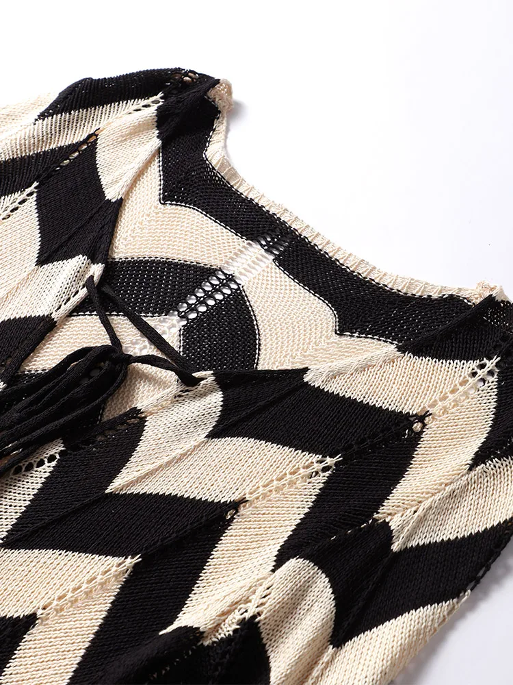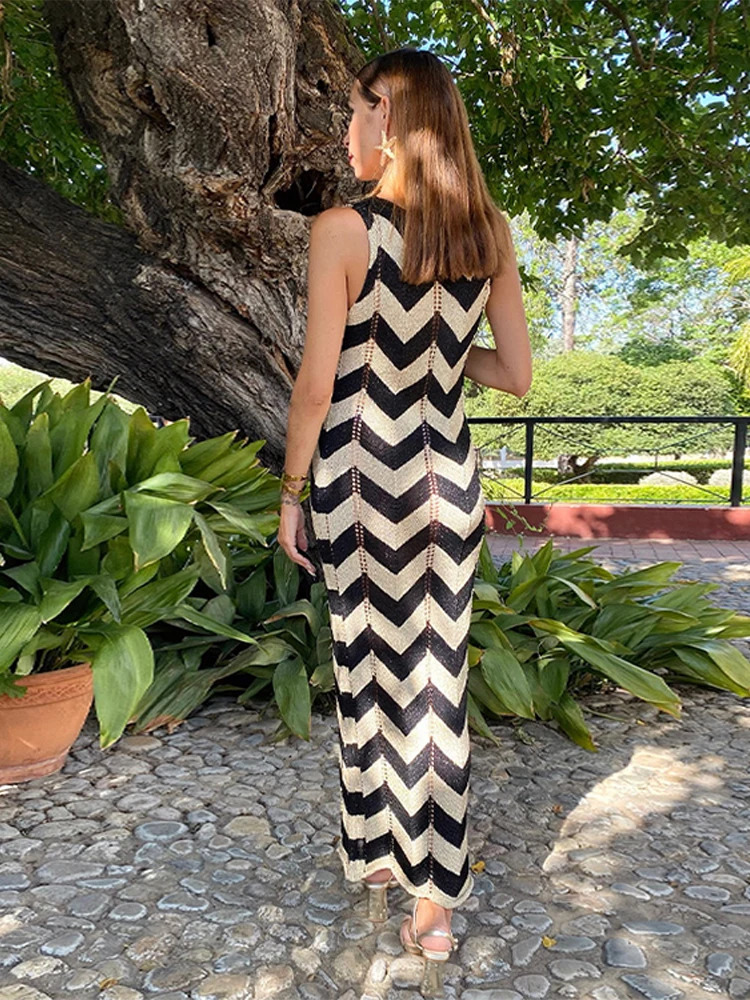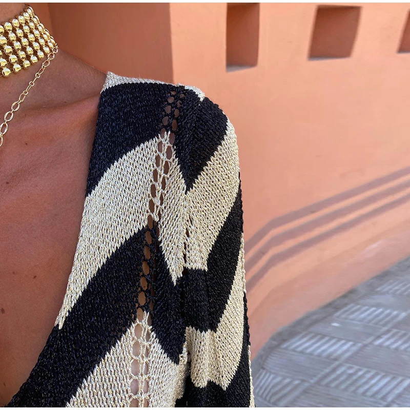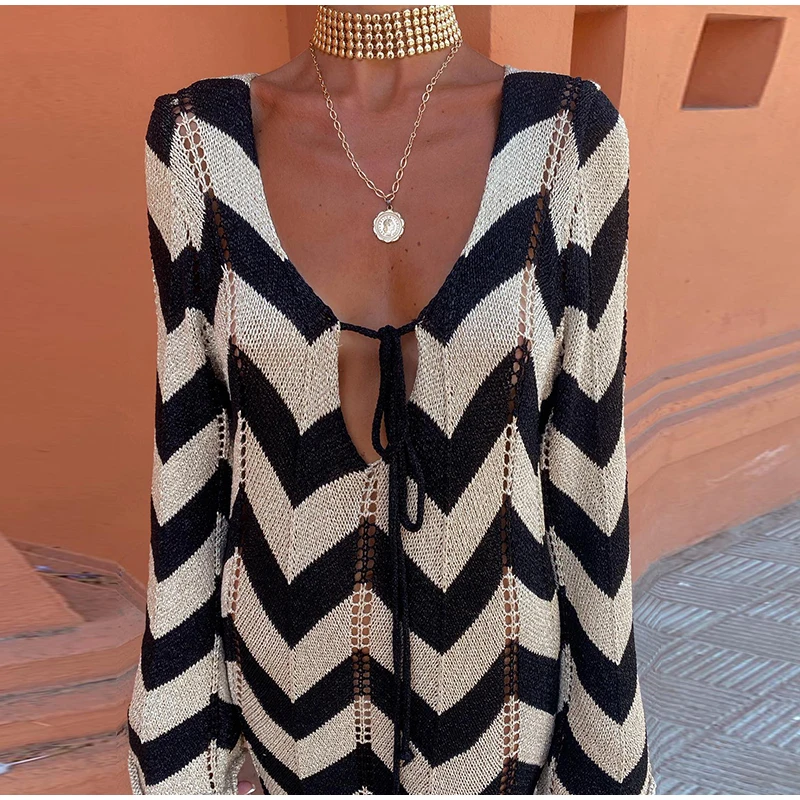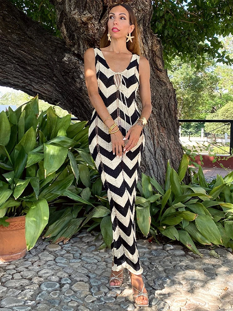 Home » Shop » Striped Knitted Women Dresses Long Sleeve Lace Up Maxi Beach Dress For Woman Slim Knitting Hollow Out Square Neck Robes