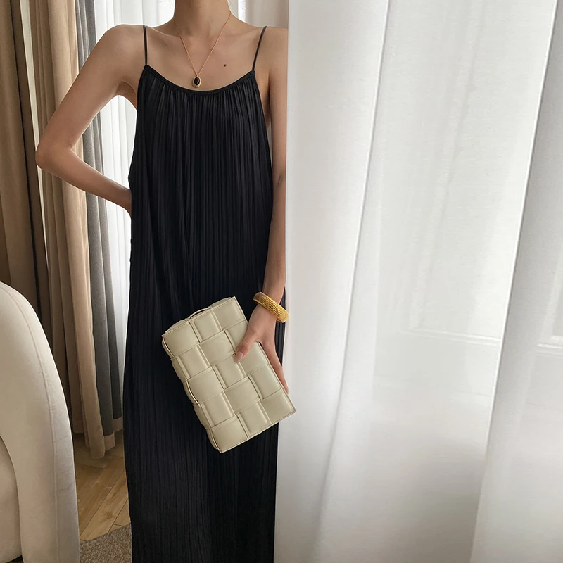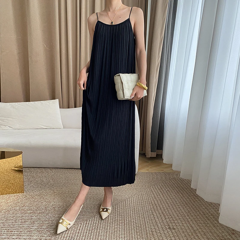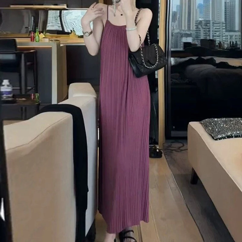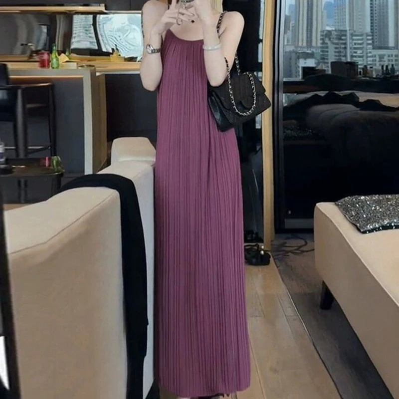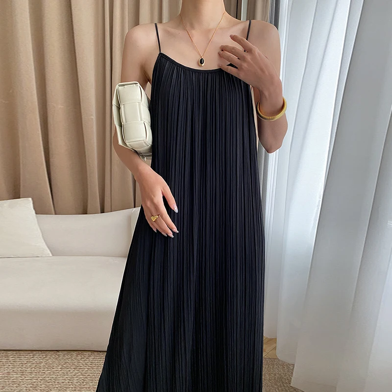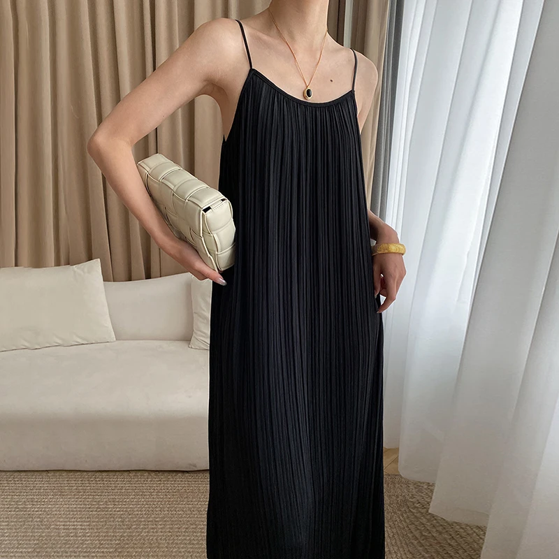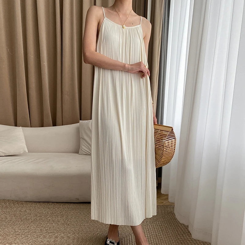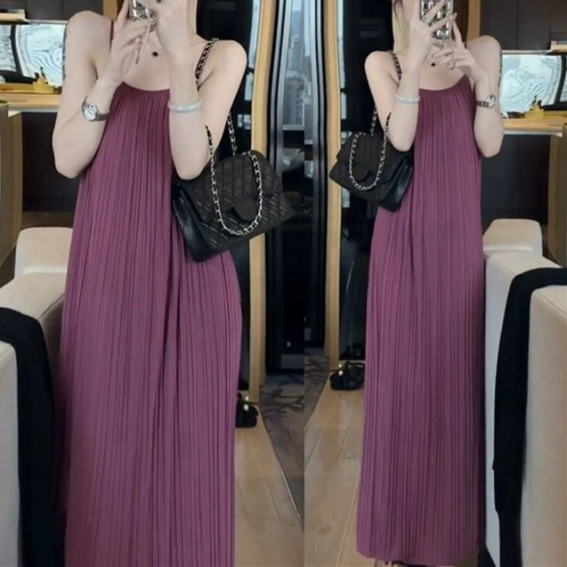 Women Summer Sleeveless Pleated O-neck Spaghetti Strap Loose Sexy Maxi Dress
