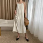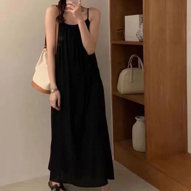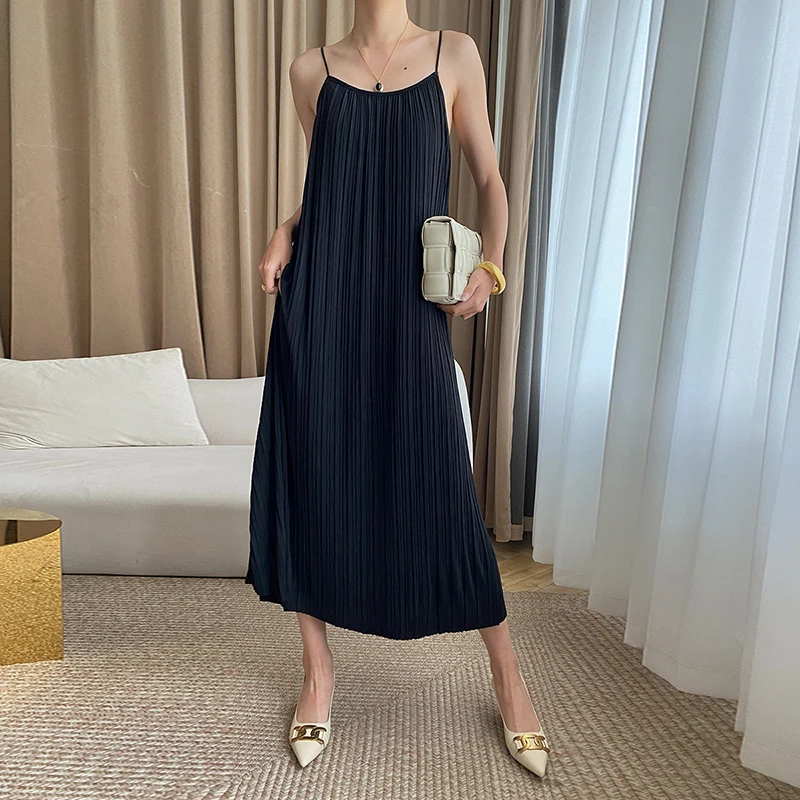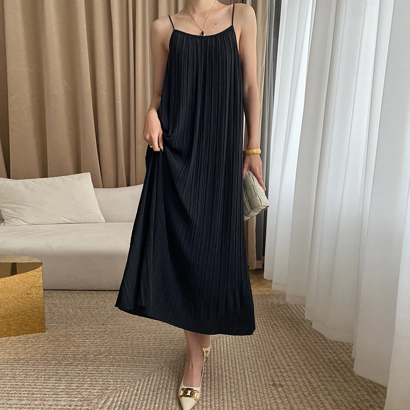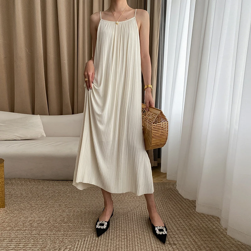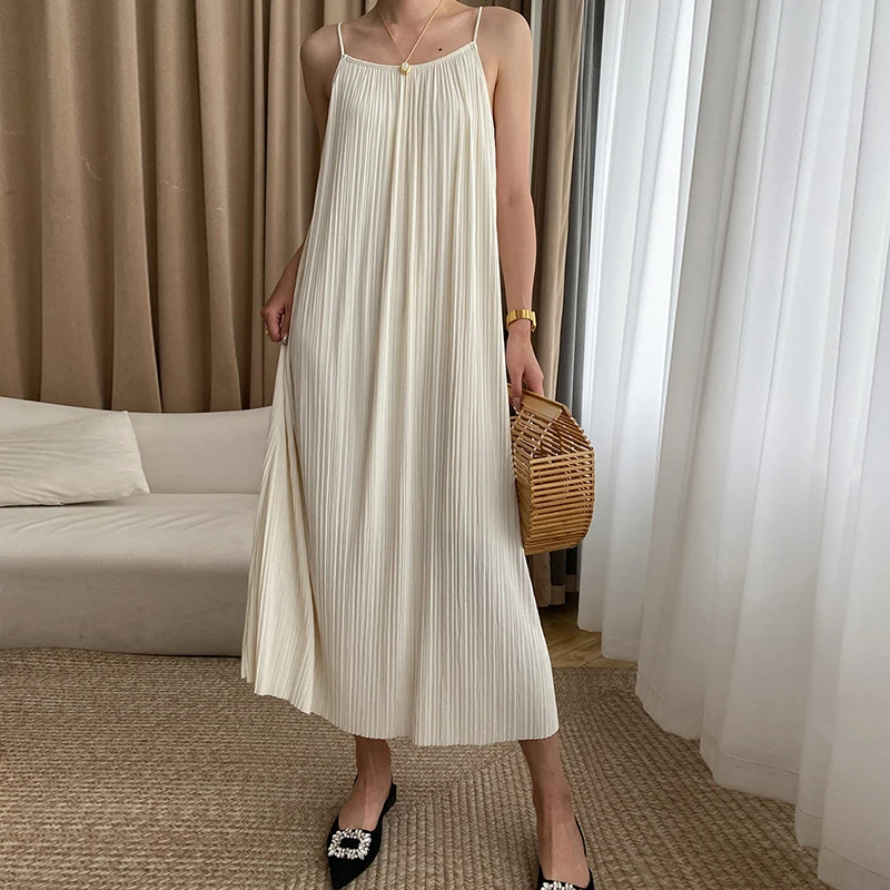 Home » Shop » Women Summer Sleeveless Pleated O-neck Spaghetti Strap Loose Sexy Maxi Dress